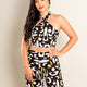 Blusa elegante de diseño cruzado con cuello halter, confeccionada en tela suave y ajustada al cuerpo. Su estructura drapeada realza la silueta, brindando un look sofisticado y versátil, ideal para ocasiones especiales o outfits casuales con un toque chic.